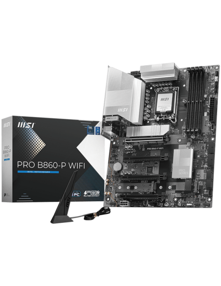 MSI PRO B860-P WIFI, ATX, LGA 1851, 4x DDR5 Dual Channel DDR5 up to 8600(OC)MHz, 4x PCIe x16 slot, 3x M.2 slot, 4x USB 2.0, 2x USB 5Gbps, 2x USB 10Gbps, 1x USB 40Gbps Type-C, HDMI, DP, 7.1 HD Audio, 5G LAN, WiFi, BT, 3Y_AS