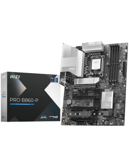 MSI PRO B860-P, ATX, LGA 1851, 4x DDR5 Dual Channel DDR5 up to 8600(OC)MHz, 4x PCIe x16 slot, 3x M.2 slot, 4x USB 2.0, 2x USB 5Gbps, 2x USB 10Gbps, 1x USB 40Gbps Type-C, HDMI, DP, 7.1 HD Audio, 5G LAN, 3Y_AS