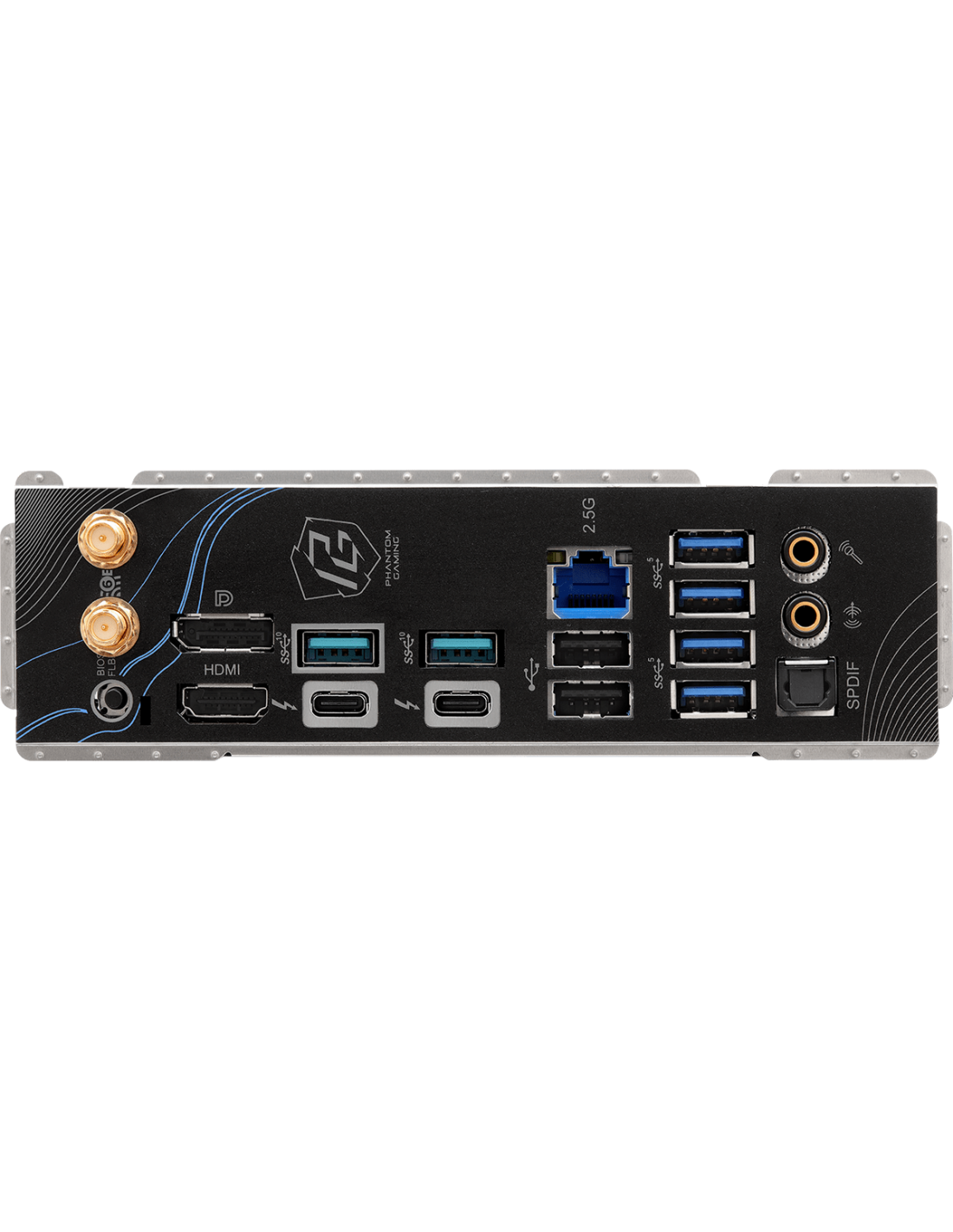 2 x Antenna Ports;1 x HDMI Port;1 x DisplayPort 1.4;1 x Optical SPDIF Out Port;2 x Thunderbolt™ 4/USB4 Type-C Ports (40 Gb/s);2 x USB 3.2 Gen2 Type-A Ports (10 Gb/s);4 x USB 3.2 Gen1 Ports;2 x USB 2.0 Ports;1 x RJ-45 LAN Port;1 x BIOS Flashback Button;1 x
