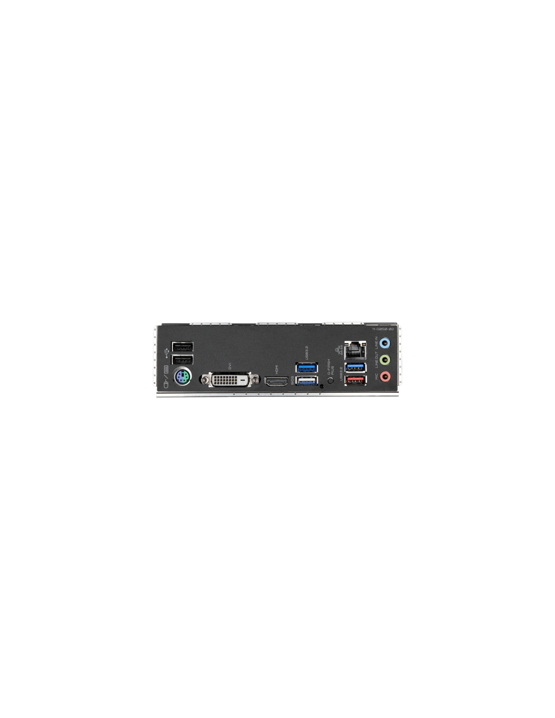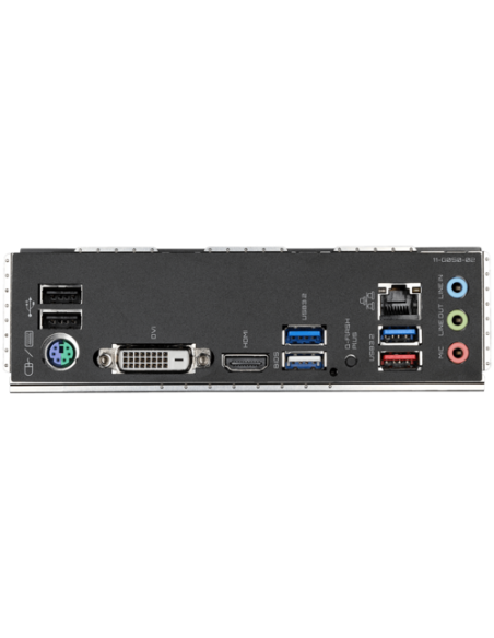 2 x USB 2.0/1.1 ports; 1 x PS/2 keyboard/mouse port; 1 x DVI-D port; 1 x HDMI port; 3 x USB 3.2 Gen 1 ports; 1 x USB 3.2 Gen 2 Type-A port (red); 1 x Q-Flash Plus button; 1 x RJ-45 port; 3 x audio jacks