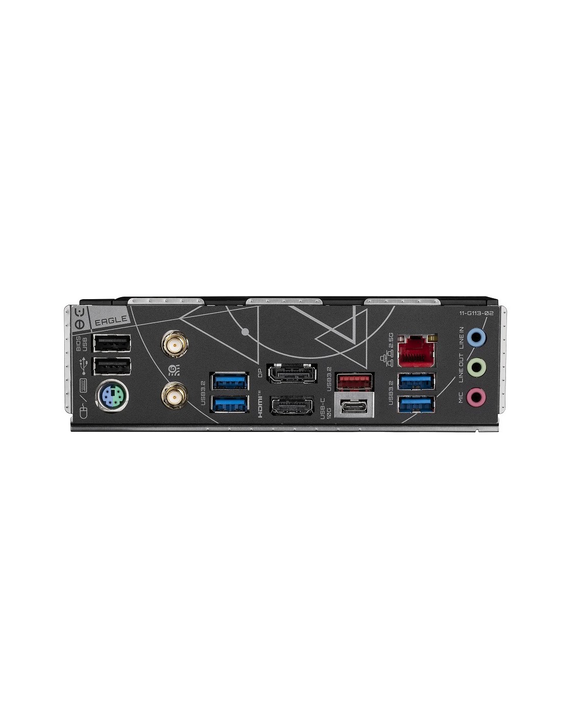 1 x PS/2 keyboard/mouse port; 1 x USB Type-C® port, with USB 3.2 Gen 2 support; 1 x USB 3.2 Gen 2 Type-A port (red); 4 x USB 3.2 Gen 1 ports; 2 x USB 2.0/1.1 ports; 2 x SMA antenna connectors (1T1R); 1 x HDMI port; 1 x DisplayPort; 1 x RJ-45 port; 3 x aud