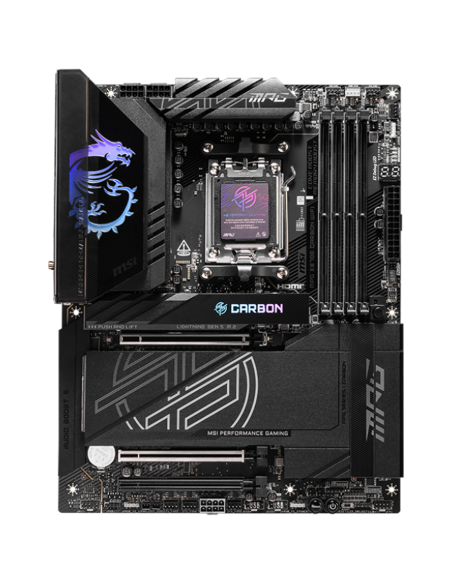 MSI MPG X870E CARBON WIFI, ATX, Socket AM5, 4x DDR5 Dual Channel DDR5 up to 8400(OC)MHz, 3x PCIe 3.0 x16 slot, 4x M.2 slot, 9x USB 10Gbps, 2x 10Gbps Type-C, 2x 40Gbps Type-C, HDMI, 7.1 HD Audio, 2.5+5G LAN, WiFI 7, BT, 3Y_AS