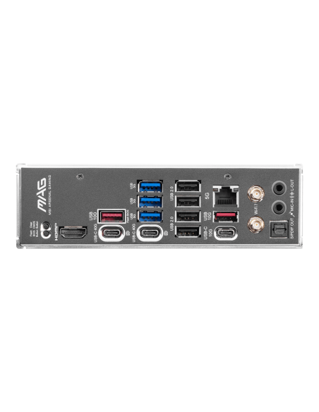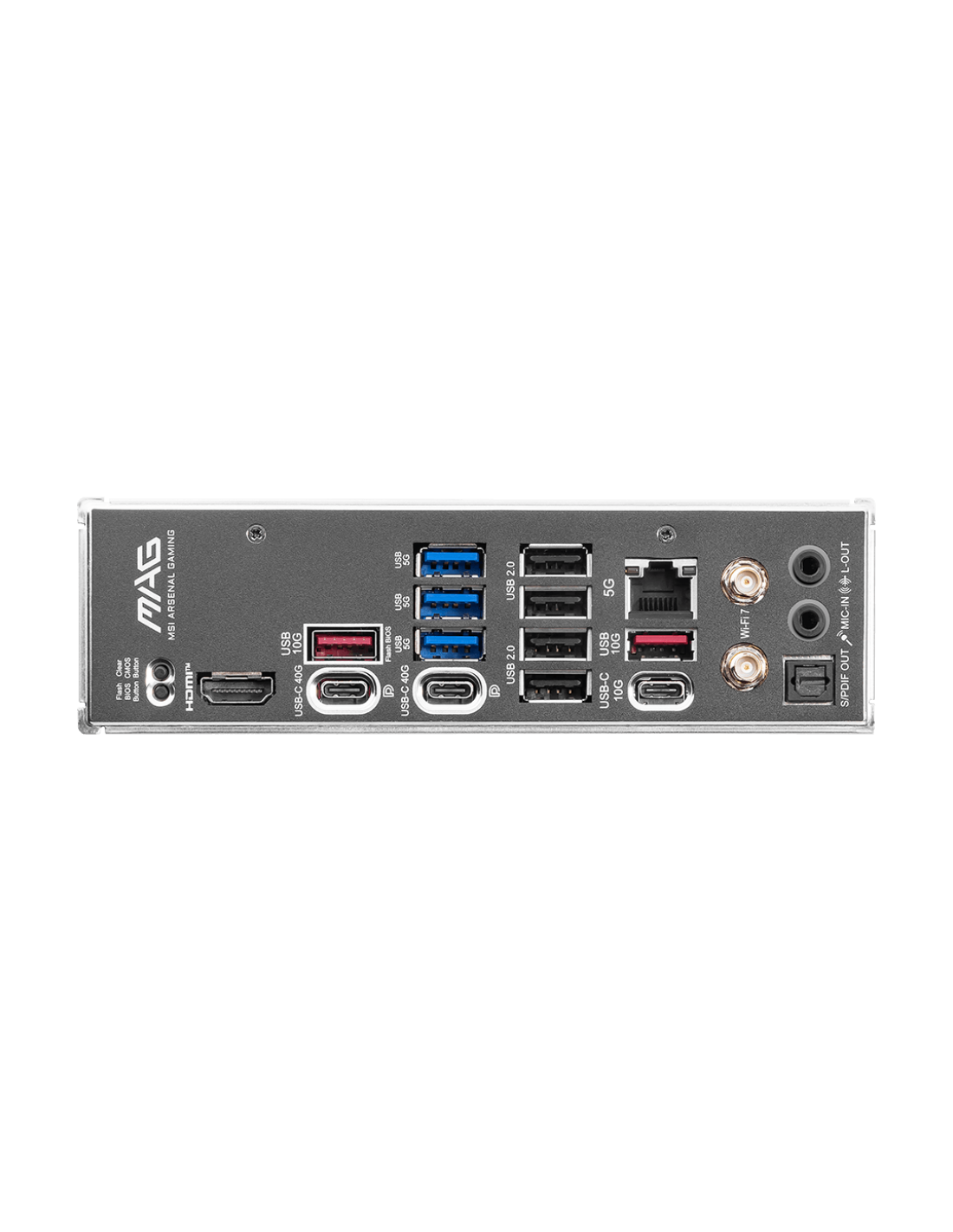 Clear CMOS Button;USB 10Gbps Type-A;USB 5Gbps Type-A;USB 2.0;5G LAN;Wi-Fi / Bluetooth;Audio connectors;Flash BIOS Button;HDMI™;USB 40Gbps Type-C;USB 10Gbps Type-C;USB 10Gbps Type-A