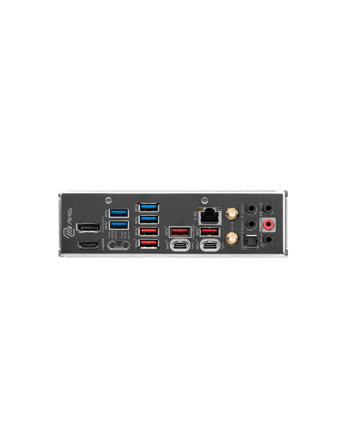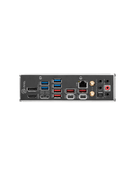 DisplayPort 1.4; USB 3.2 Gen 1 5Gbps Type-A; USB 3.2 Gen 2 10Gbps Type-A; 2.5G LAN Port,; HD Audio Connectors; HDMI™ 2.1 Port; Clear CMOS Button; Flash BIOS Button; USB 3.2 Gen 2 10Gbps Type-C; USB 3.2 Gen 2x2 20Gbps Type-C; Wi-Fi / Bluetooth Antenna; Opt