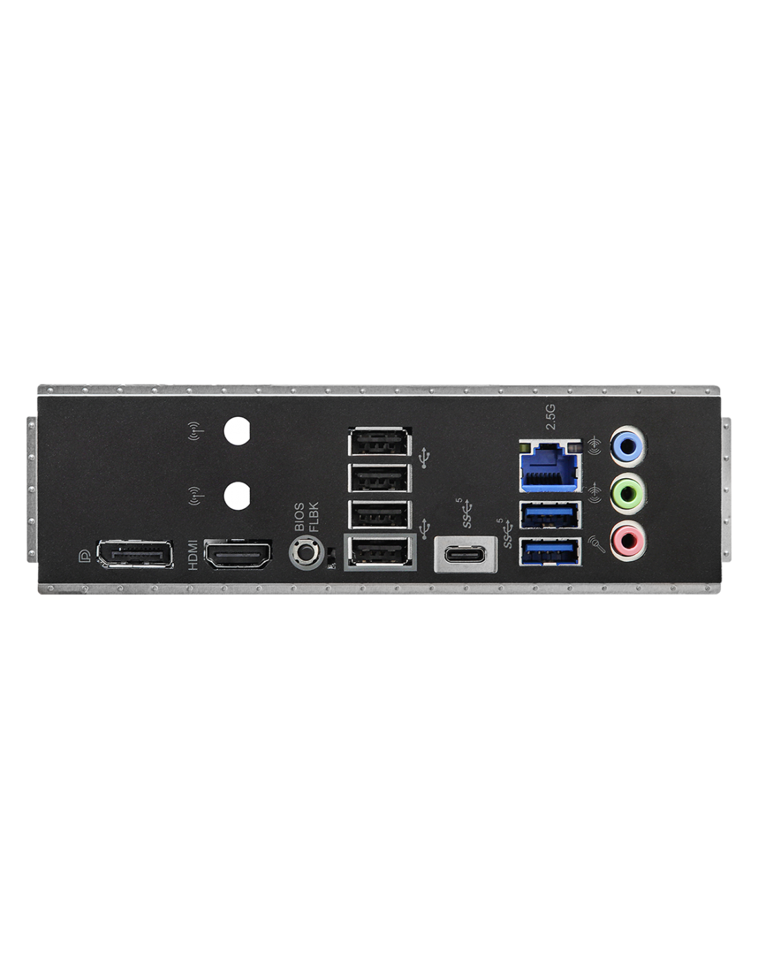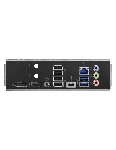 - 2 x Antenna Mounting Points; - 1 x HDMI Port; - 1 x DisplayPort 1.4; - 1 x USB 3.2 Gen1 Type-C Port; - 2 x USB 3.2 Gen1 Type-A Ports; - 4 x USB 2.0 Ports; - 1 x RJ-45 LAN Port; - 1 x BIOS Flashback Button; - HD Audio Jacks: Line in / Front Speaker / Mic