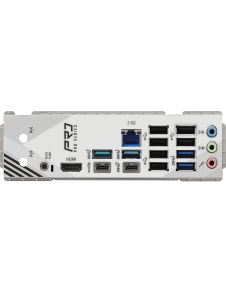 2 x Antenna Mounting Points;1 x HDMI Port;1 x USB 3.2 Gen2 Type-C Port (10 Gb/s);1 x USB 3.2 Gen1 Type-C Port (DP-alt mode supports DP1.4a);4 x USB 3.2 Gen1 Type-A Ports;6 x USB 2.0 Ports;1 x RJ-45 LAN Port;1 x BIOS Flashback Button;HD Audio Jacks: Line i
