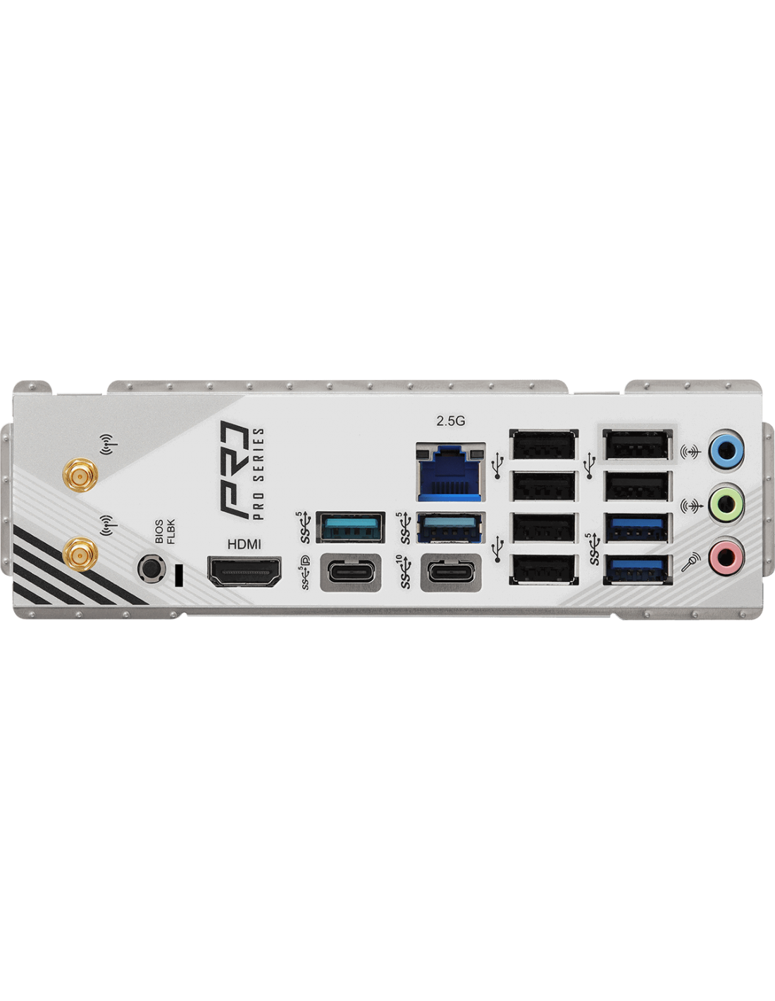 2 x Antenna Ports;1 x HDMI Port;1 x USB 3.2 Gen2 Type-C Port (10 Gb/s);1 x USB 3.2 Gen1 Type-C Port (DP-alt mode supports DP1.4a);4 x USB 3.2 Gen1 Type-A Ports;6 x USB 2.0 Ports;1 x RJ-45 LAN Port;1 x BIOS Flashback Button;HD Audio Jacks: Line in / Front