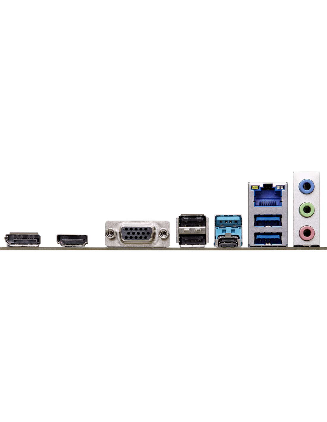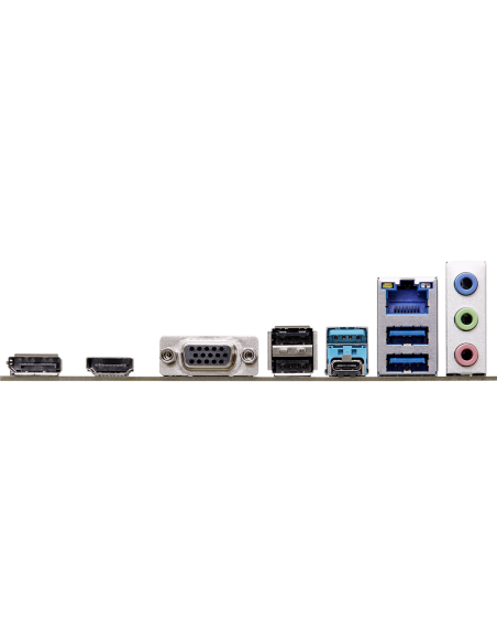 - 2 x Antenna Mounting Points; - 1 x D-Sub Port; - 1 x HDMI Port; - 1 x DisplayPort 1.4; - 1 x USB 3.2 Gen1 Type-C Port; - 3 x USB 3.2 Gen1 Type-A Ports; - 2 x USB 2.0 Ports; - 1 x RJ-45 LAN Port; - HD Audio Jacks: Line in / Front Speaker / Microphone