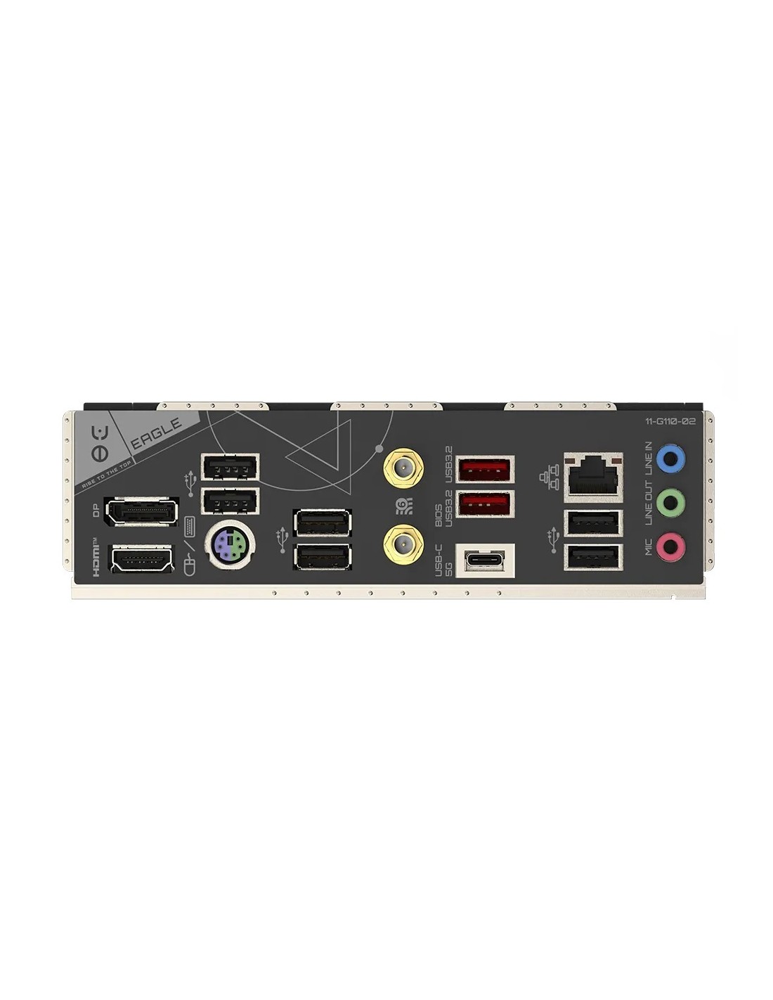 1 x DisplayPort; 1 x HDMI port; 1 x PS/2 keyboard/mouse port; 2 x SMA antenna connectors (2T2R); 1 x USB Type-C® port, with USB 3.2 Gen 1 support; 2 x USB 3.2 Gen 2 Type-A ports (red); 6 x USB 2.0/1.1 ports; 1 x RJ-45 port; 3 x audio jacks