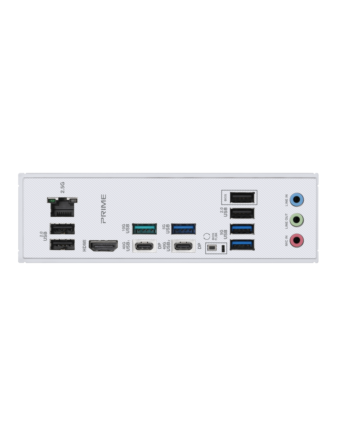 2 x USB4® (40Gbps) ports (2 x USB Type-C®);1 x USB 10Gbps port (1 x Type-A);3 x USB 5Gbps ports (3 x Type-A);4 x USB 2.0 ports (4 x Type-A);1 x HDMI™ port;1 x Realtek 2.5Gb Ethernet port;3 x Audio jacks;1 x BIOS FlashBack™ button