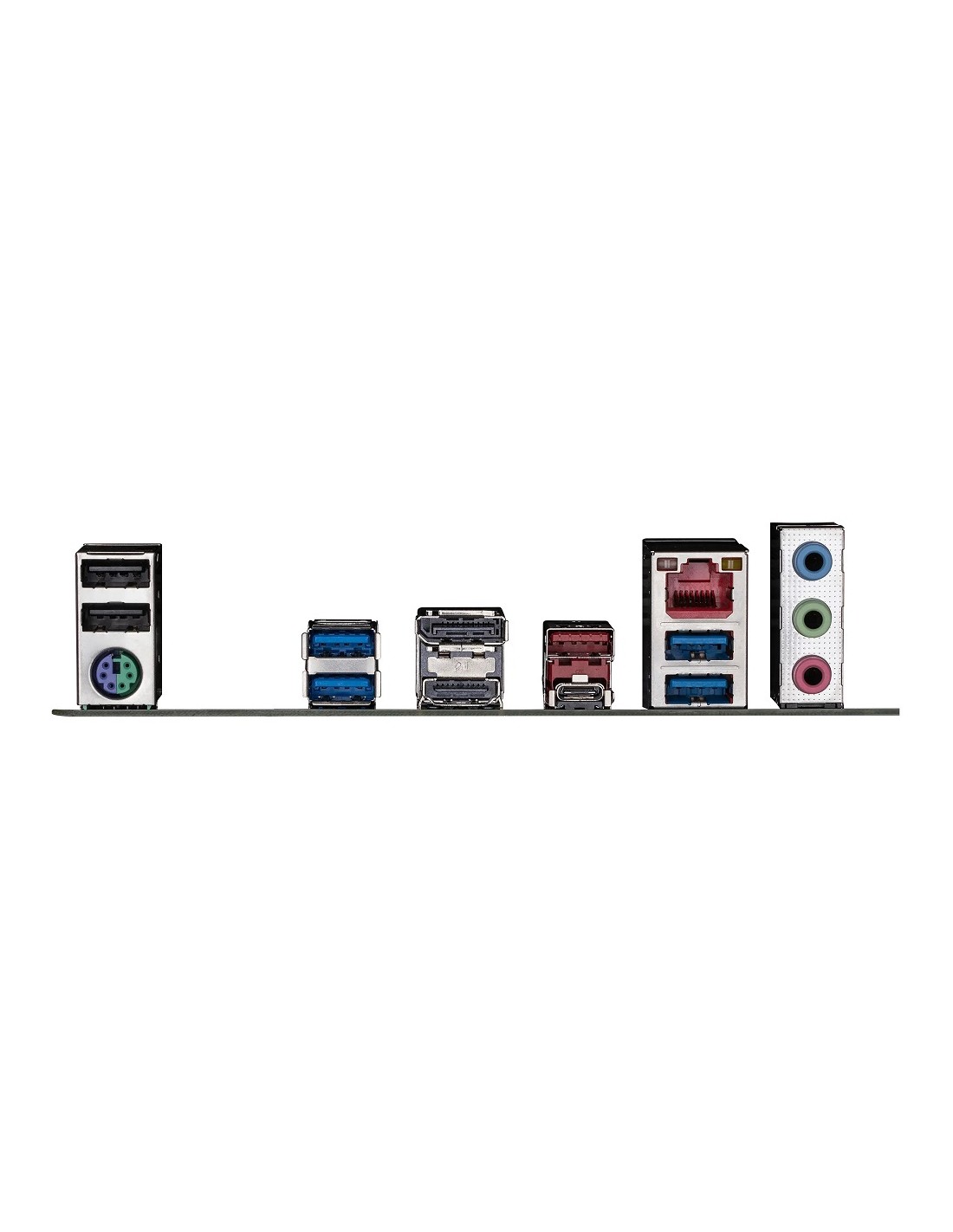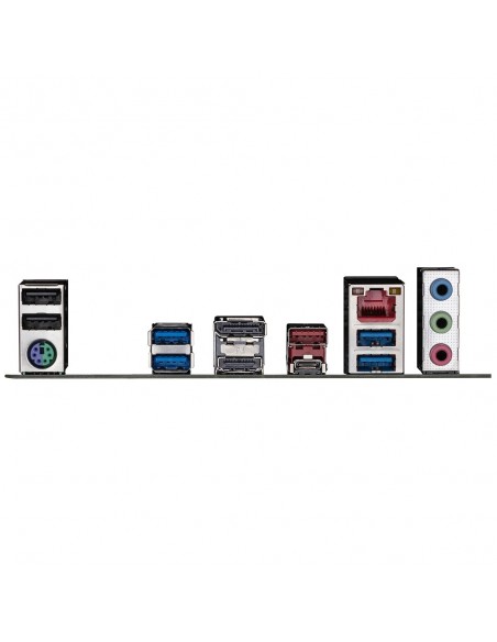 1 x PS/2 keyboard/mouse port; 1 x USB Type-C® port, with USB 3.2 Gen 2 support; 1 x USB 3.2 Gen 2 Type-A port (red); 4 x USB 3.2 Gen 1 ports; 2 x USB 2.0/1.1 ports; 1 x HDMI port; 1 x DisplayPort; 1 x RJ-45 port; 3 x audio jacks