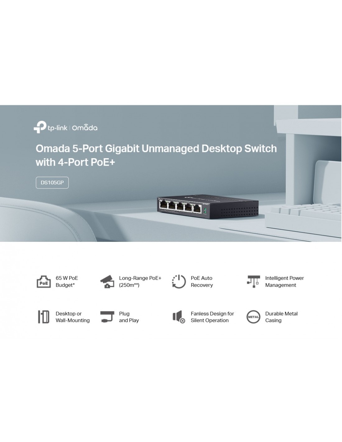 5-портов гигабитов неуправляем настолен комутатор TP-Link DS105GP с 4-порта PoE+ _VI
