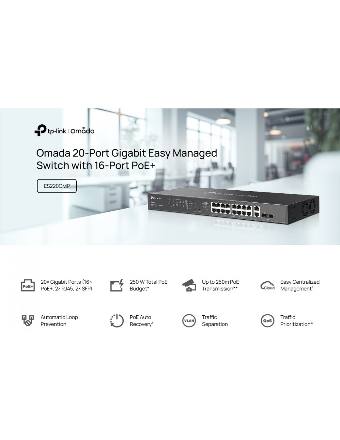 20-портов комутатор TP-Link Omada ES220GMP Gigabit Easy Managed Switch с 16 PoE+ порта