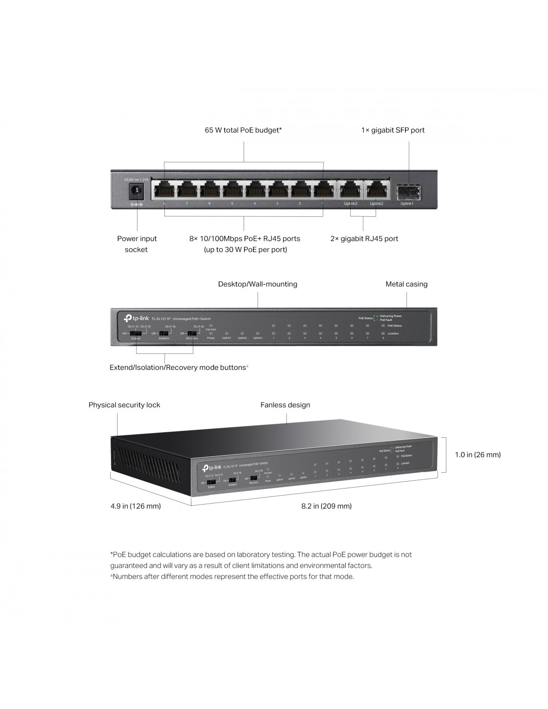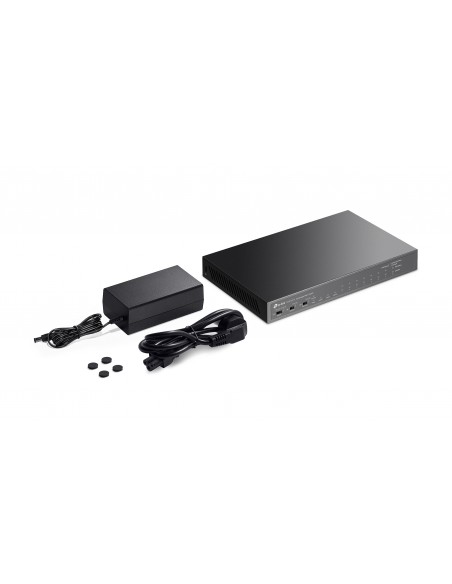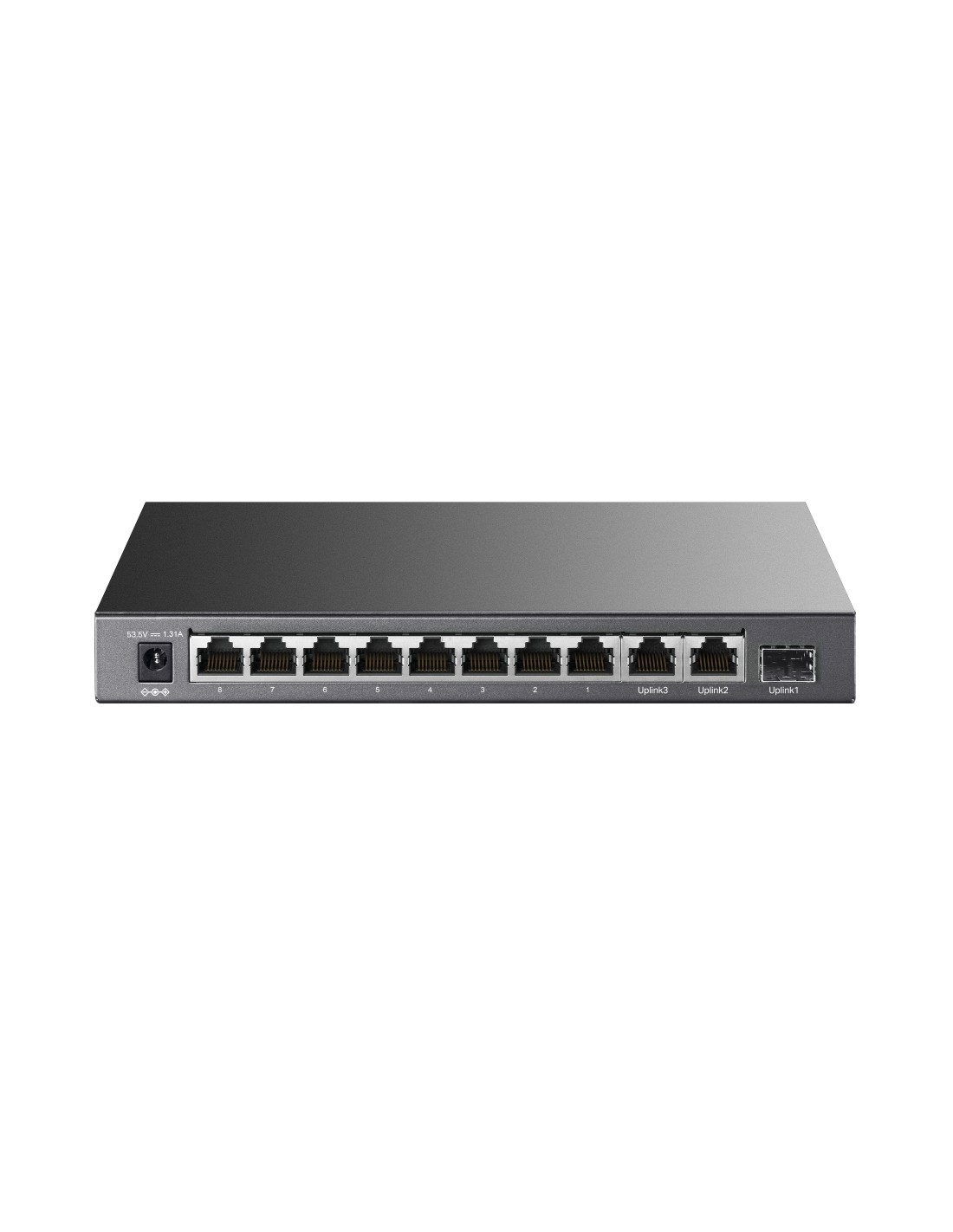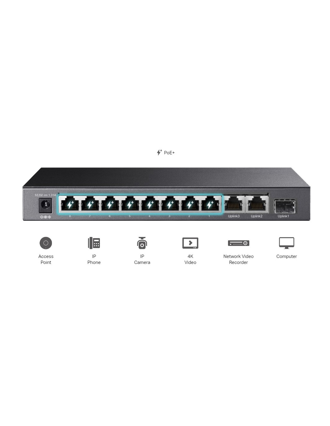 8× 10/100 Mbps 802.3af/at PoE+ Ports, 2× Gigabit RJ45 Ports, 1× Gigabit SFP Port