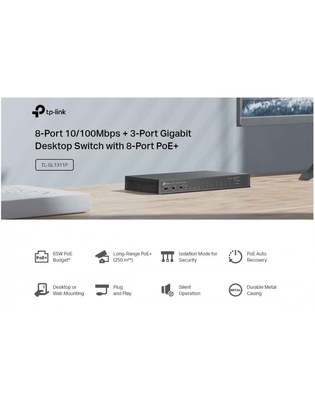 8-портов 10/100Mbps + 3-портов гигабитов настолен комутатор с 8-портов PoE+ TP-Link TL-SL1311P _VI