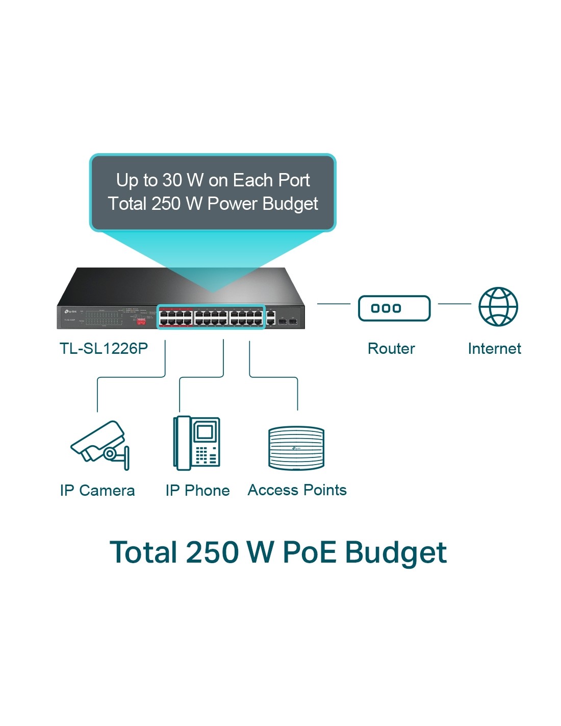 PoE Ports: Port 1 – Port 24, PoE Power Budget: 250W