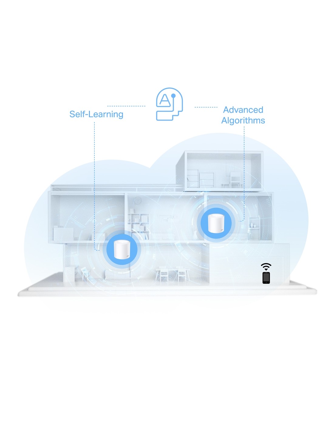 TP-Link Mesh означава, че устройствата Deco работят заедно, за да образуват една обединена мрежа. Вашият телефон или таблет автоматично се свързва с най-бързия Deco, докато се движите из дома си, създавайки наистина безпроблемно WiFi изживяване.‡