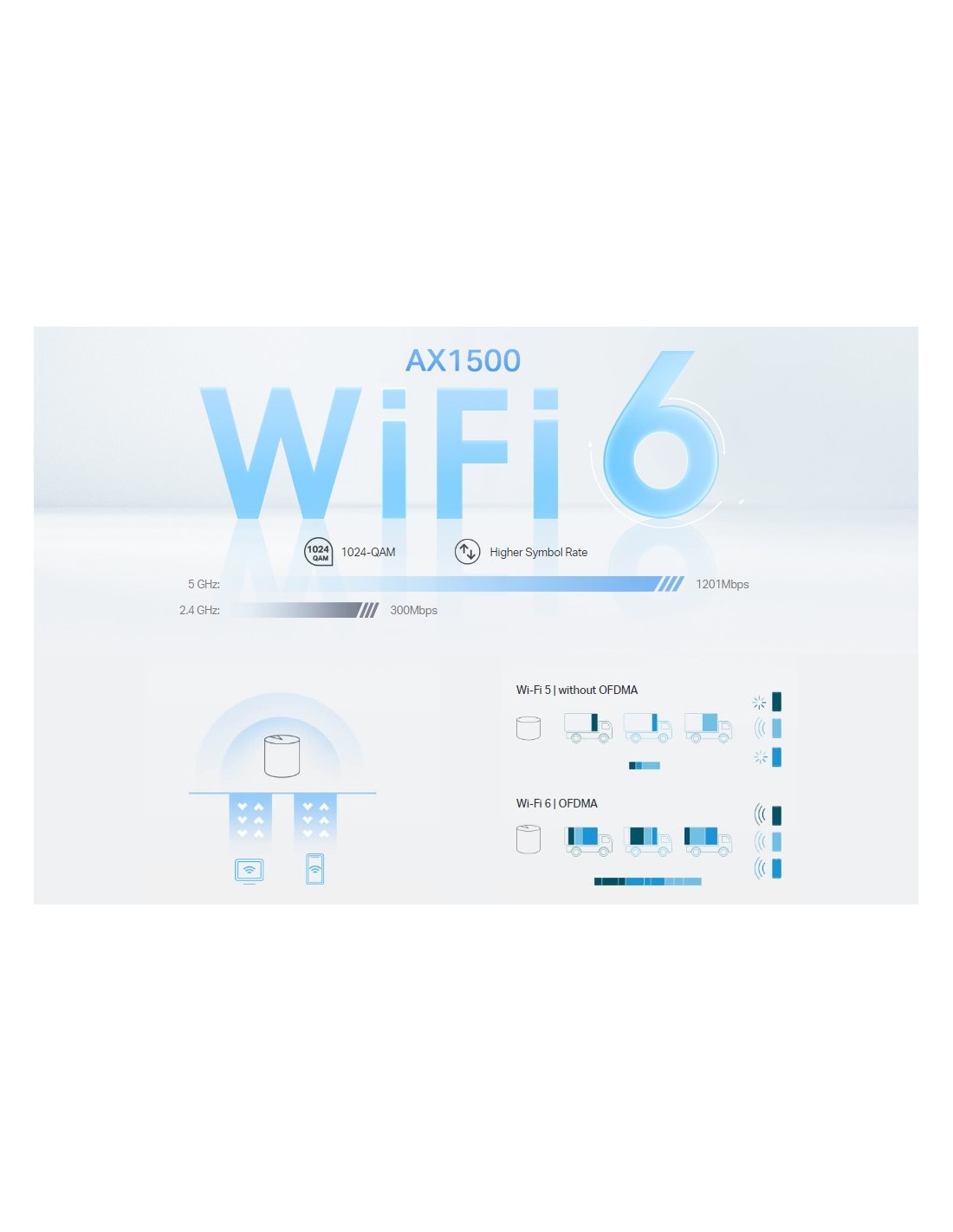По-бързи връзки: Wi-Fi 6 скорост до 1500 Mbps—1201 Mbps на 5 GHz и 300 Mbps на 2,4 GHz.†