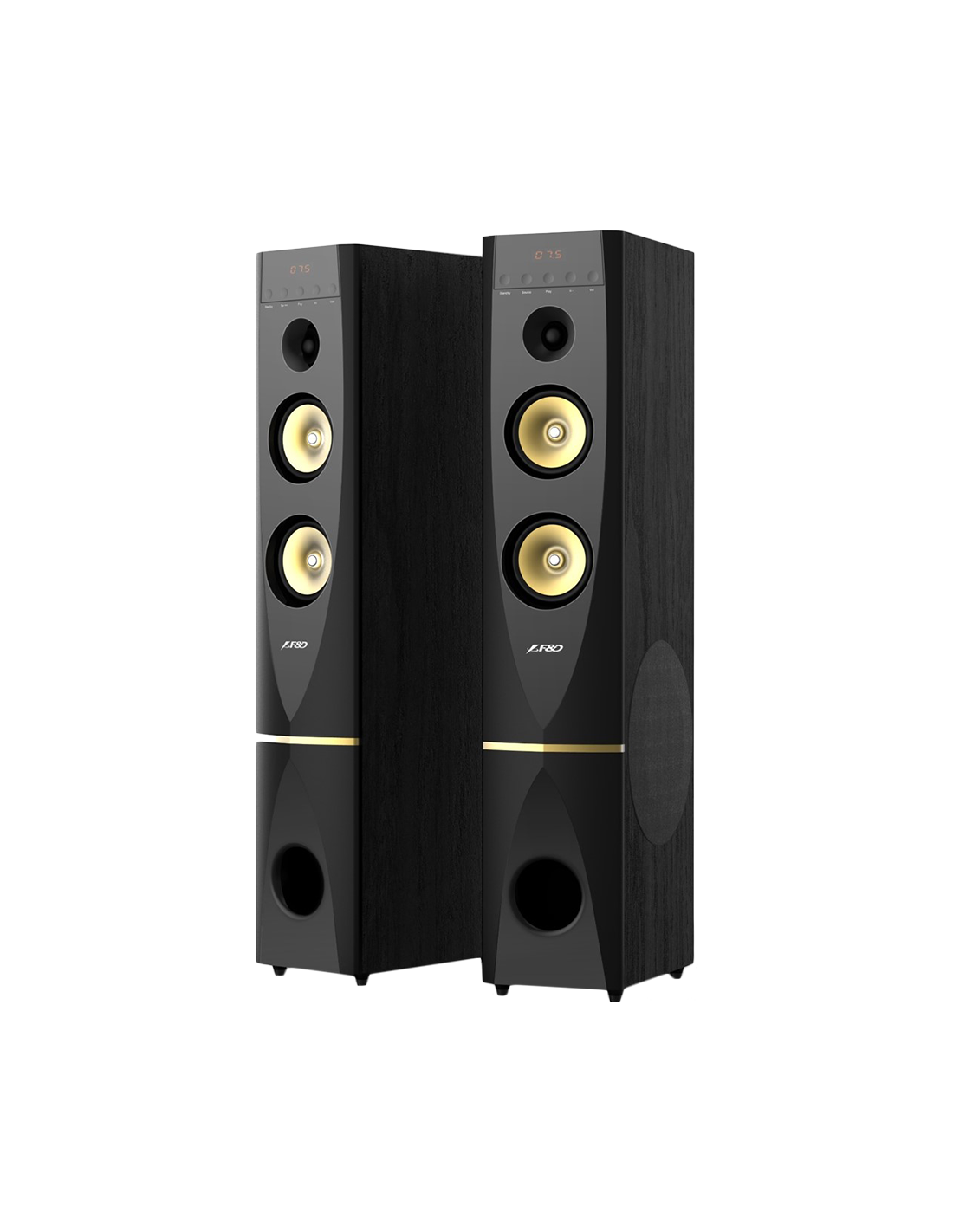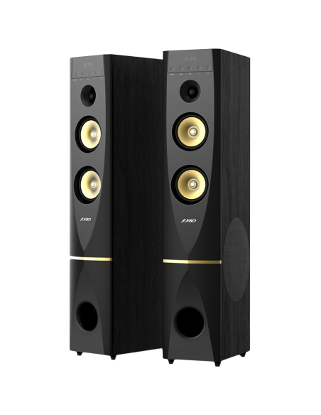 F&D T-88X 2.0 Floorstanding Speakers, 300W RMS (150x2), 1'' Tweeter + 5.25'' Speaker + 10'' Subwoofer for each channel, BT 4.2/HDMI/Optical/Coaxial/AUX/USB/FM/Karaoke function/LED Display/Remote Control/Microphone included/Wooden/Black_AS