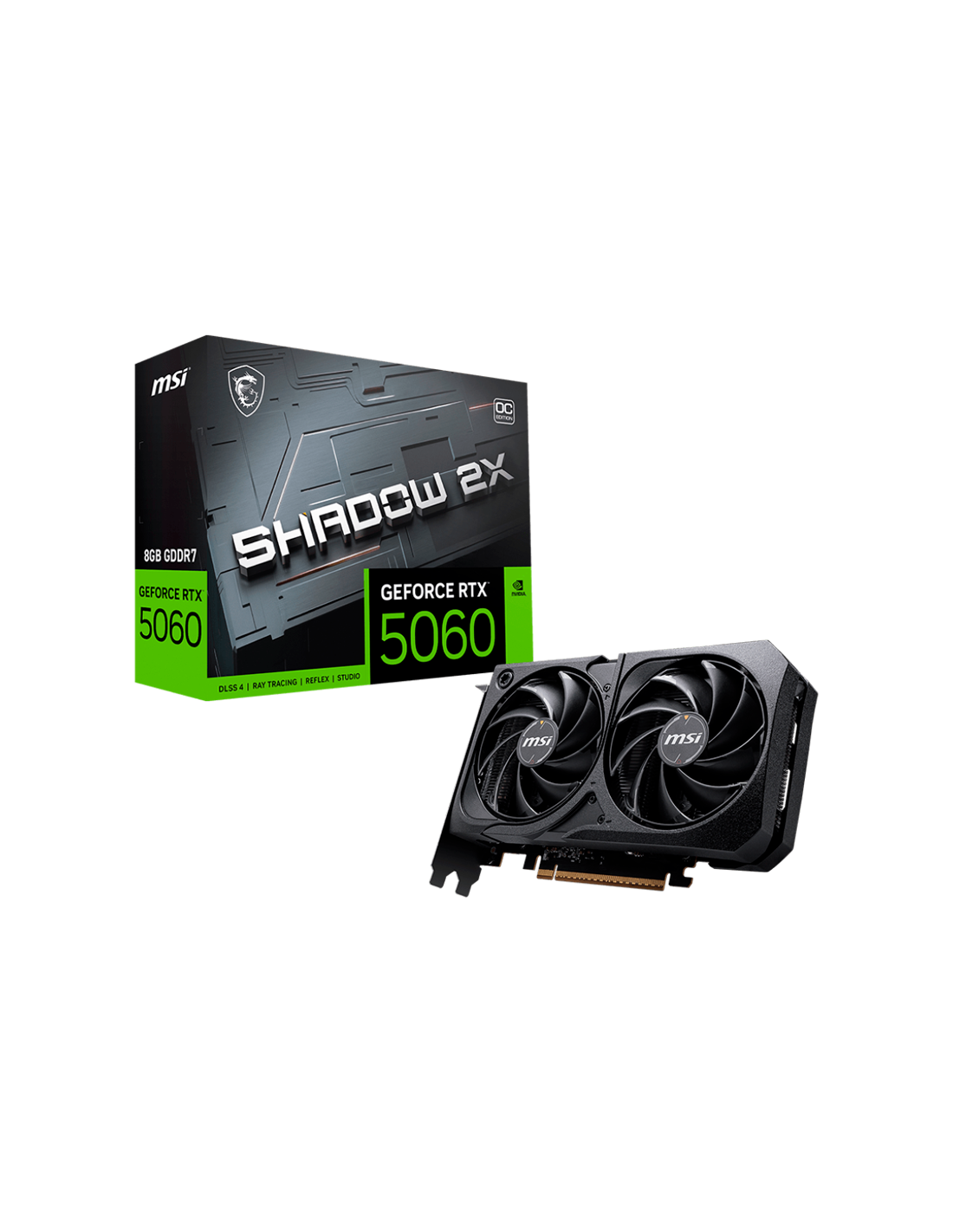 MSI Video Card NVIDIA GeForce RTX 5060 8G SHADOW 2X OC, 8GB GDDR7, 128-bit, 2535 MHz Boost, 3840 CUDA Cores, PCIe 5.0 (x8), 3x DP 2.1b, HDMI 2.1b, RAY TRACING, Dual Fan, 145W TDP, 8-pin PCIe Power, G-SYNC, 2-Slot, 3Y_AS